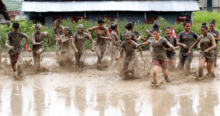 Local children play in the mud to celebrate the Asar 15, dhan diwas in Chagunarayan, Bhaktapur on Friday.