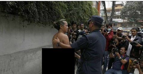 भित्री बस्त्रसमेत नलगाएका उनले ‘जनावर सबै एक हुन्, कानून सबैलाई लागू गर, नयाँ मुलुकी ऐन संशोधन गर, राष्ट्रिय जनावर बदली गर’ लेखिएको प्लेकार्डले आफ्नो यौनाङ्ग छोपेका थिए । उनलाई प्रहरीले पक्राउ गरेर लगेको छ । पक्राउ पर्ने युवक जितिन लिम्बु हुन् ।