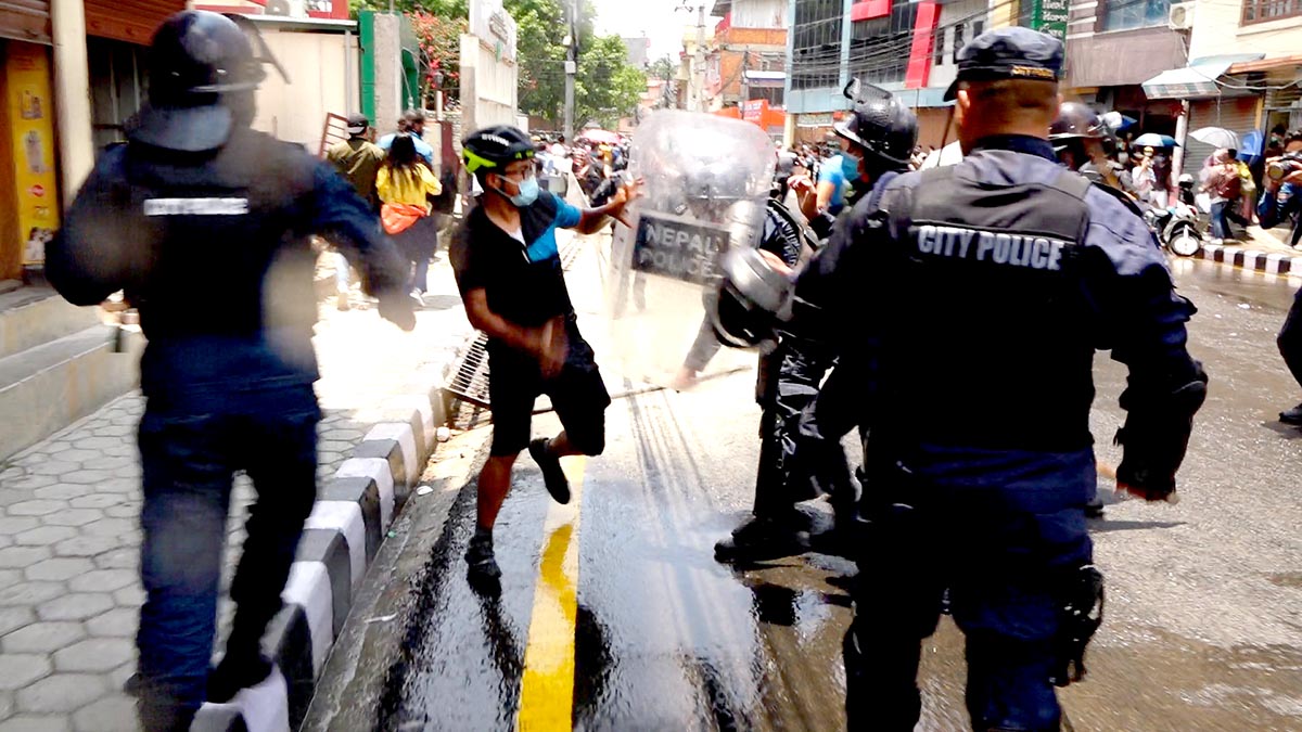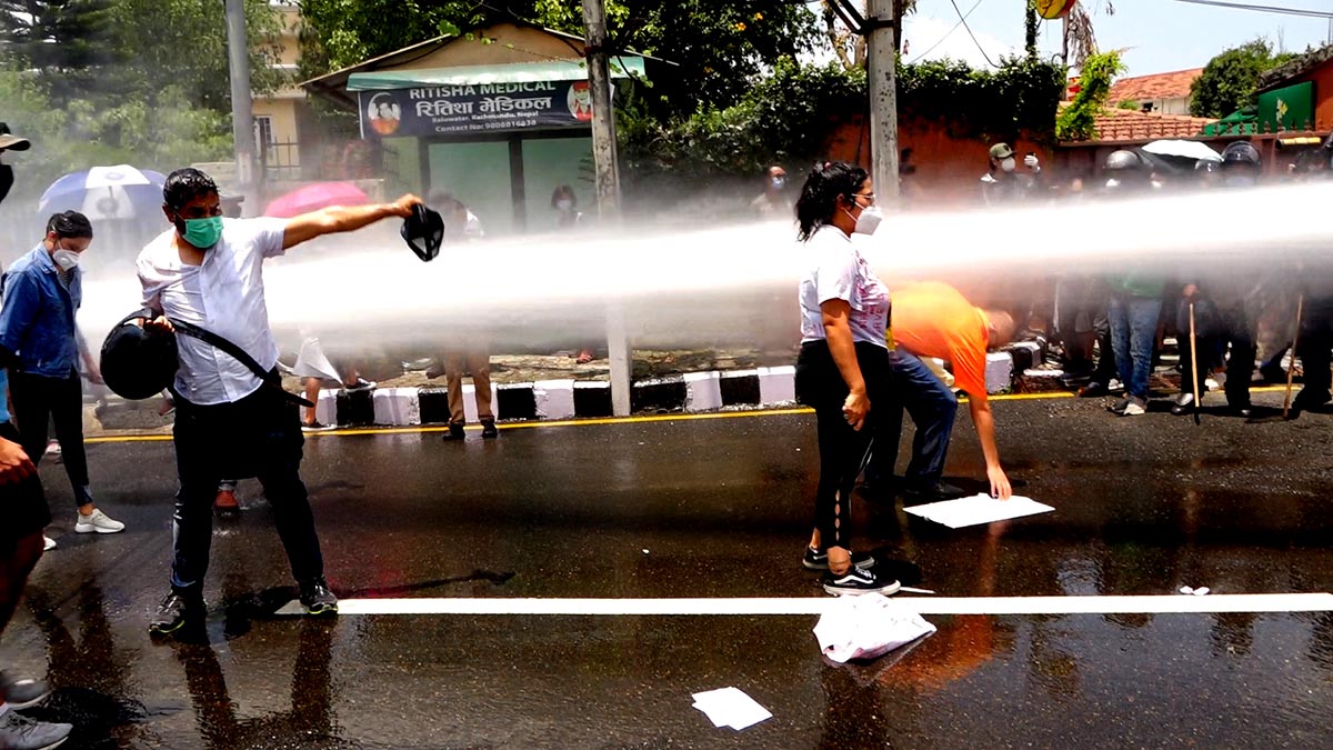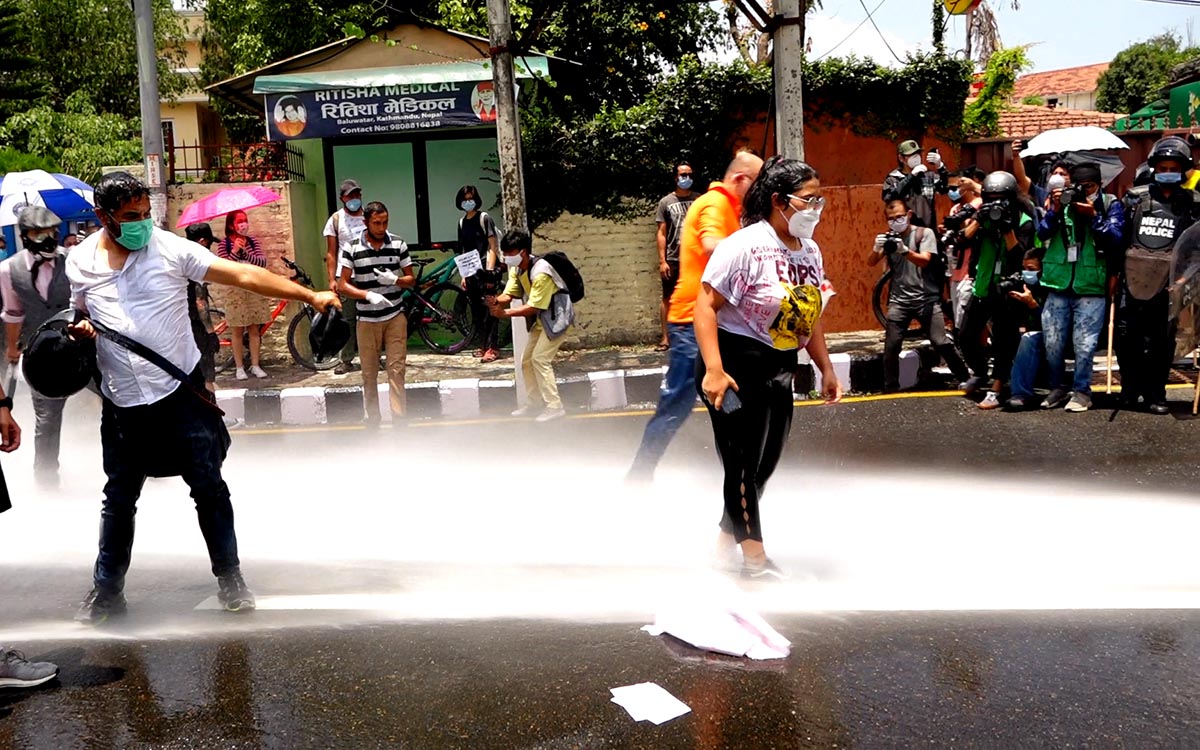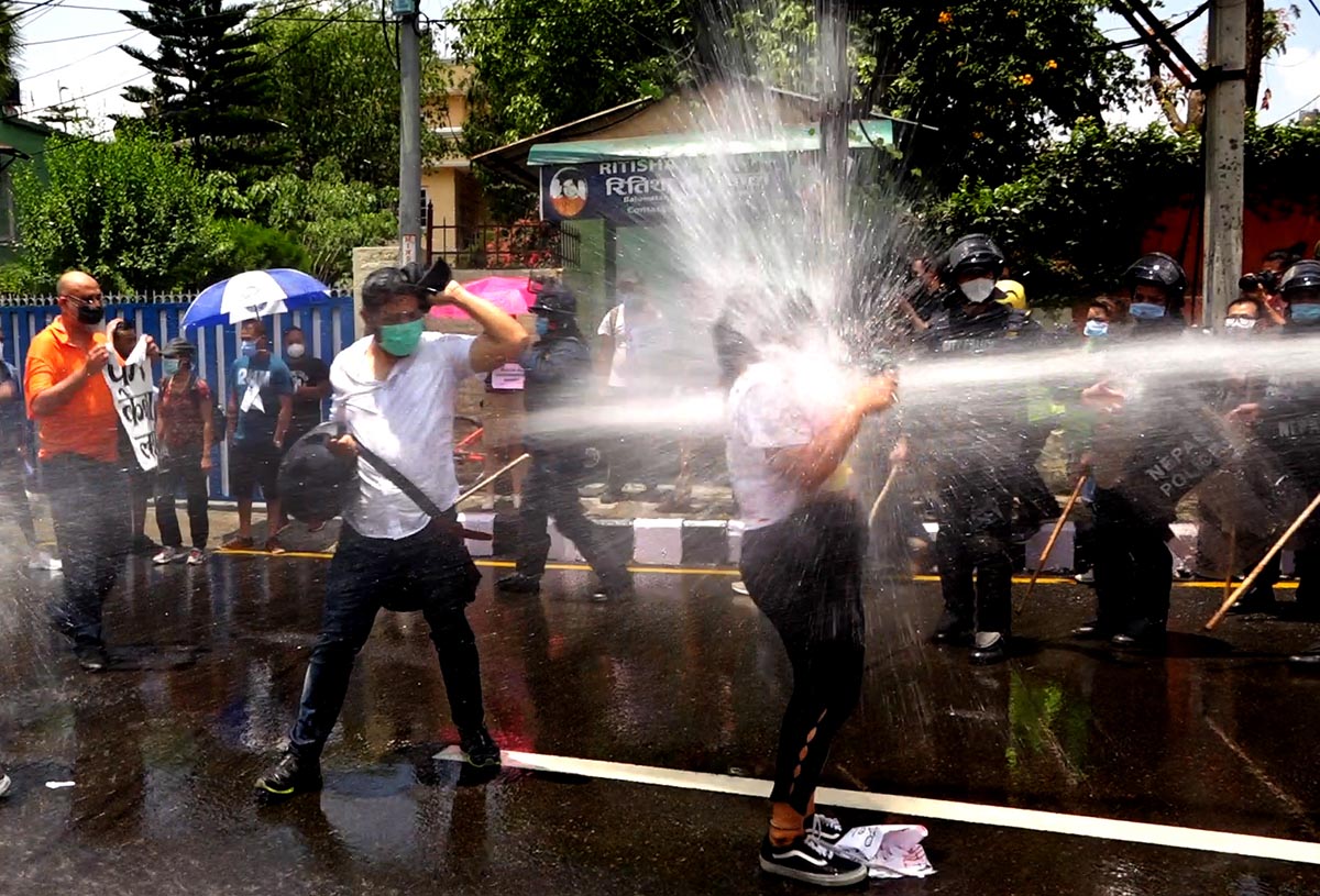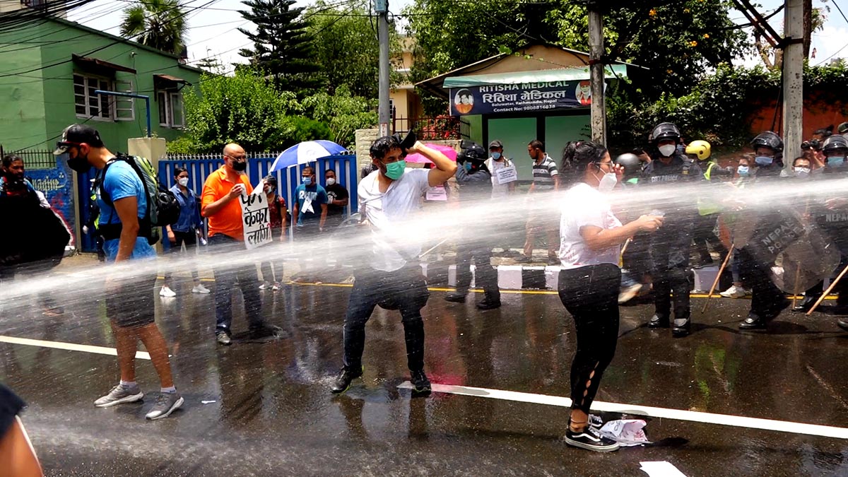 हाम्रा सहकर्मी मुकुन्द कालिकोटेकाअनुसार प्रहरीले प्रदर्शनकारीलाई पानीको फोहोरा हानेको थियो । सोही क्रममा प्रहरी र प्रदर्शनकारीबीच झडप पनि भएको थियो । प्रदर्शनकारीहरुले कोरोना भाइरसको परीक्षण पीसीआर विधिबाट मात्रै गर्नुपर्ने, क्वारेन्टिन सेन्टरहरु पूर्ण सुरक्षित बनाउनु पर्ने तथा सबैको जीवन रक्षा गर्नु पर्ने लगायतका माग अघि सारेका छन् । तस्विर : मुकुन्द कालिकोटे, रिपोर्टर्स नेपाल डटकम