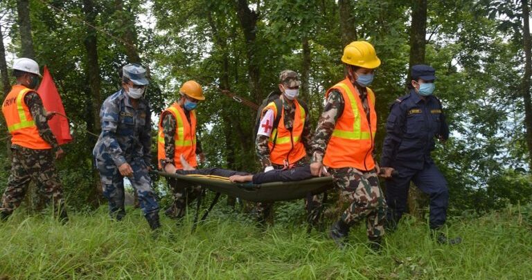 बनेपा, ८ साउन: विपद् व्यवस्थापन समिति काभ्रेपलाञ्चोकले विपद्मा परेकालाई कसरी खोज तथा उद्धार गर्ने भन्ने विषयमा बिहीबार धुलिखेलमा गरेको पूर्व अभ्यासका क्रममा उद्धारपछि उपचारका लागि लैजाने विधिको प्रदर्शन गर्दै सुरक्षाकर्मी ।