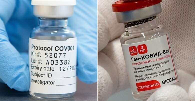 (FILES) In this file photo taken on December 04, 2020, production of Russia's Gam-COVID-Vac vaccine against Covid-19 registered under trade name Sputnik V, developed by the Gamaleya Research Institute of Epidemiology and Microbiology in coordination with the Russian Defence Ministry, at the facility of Russia's biotech company BIOCAD in Strelna outside Saint Petersburg. - Pharmaceutical giant AstraZeneca's Russian branch said on December 11, 2020 it would use part of Russia's homemade Sputnik V vaccine in further clinical trials. (Photos by John Cairns and Olga MALTSEVA / various sources / AFP) / RESTRICTED TO EDITORIAL USE - MANDATORY CREDIT "AFP PHOTO / UNIVERSITY OF OXFORD / John Cairns " - NO MARKETING - NO ADVERTISING CAMPAIGNS - RESTRICTED TO ILLUSTRATING STORIES RELATED TO THE PARTICULAR VACCINE, EVENTS AND FACTS MENTIONED IN THE CAPTION - DISTRIBUTED AS A SERVICE TO CLIENTS / (Photo by JOHN CAIRNS,OLGA MALTSEVA/AFP via Getty Images)