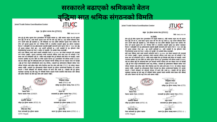 काठमाडौ । सरकारले बढाएकाे श्रमिककाे न्युनतम बेतन वृद्धिमा सात श्रमिक संगठनले असहमति जनाएका छन् । विभिन्न सात मजदुर संगठनका नेताहरुले प्रेस विज्ञप्ति मार्फत आफ्नो संगठनकाे विमति रहेको बताएका छन् ।