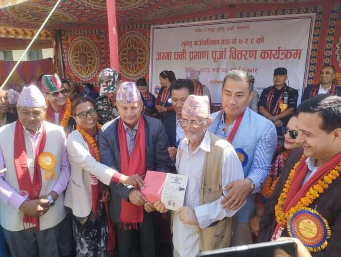 काभ्रेपलान्चोक । विगत करिब आधा शताब्दीदेखि लालपुर्जाविहीन रहेका भुम्लुका नागरिकहरूले अखेर धनी पुर्जा प्राप्त गरेका छन्। भूमि व्यवस्था तथा सहकारी विकास मन्त्री बलराम अधिकारीले आज एक कार्यक्रममार्फत लाभग्राहीहरूलाई पुर्जा वितरण गर्नुभएको हो।